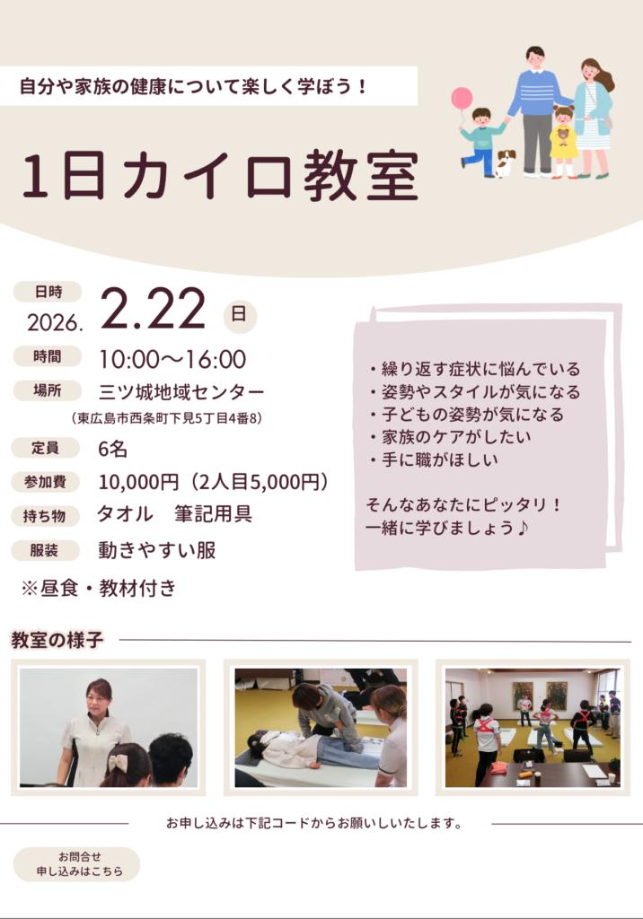 けんこうなかまの施術院では、『1日カイロ教室』を定期的に開催中!次回2026.2.8→三原会場2026.2.22→東広島会場です!こんな方が来られています!・ご自分のからだを良くするため・ご家族の健康のため・手に職が欲しい・空いた時間に副業でやってみたい・子育てしながら学んでみたい・本業としてやってみたいお気軽にご参加くださいませ!※人数制限を設けております。 最寄りの店舗の先生に 事前連絡をお願いします。